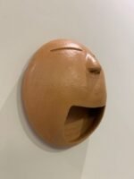 Escultura Bocejo Divertido redondo no tamanho M em cerâmica é uma peça única, feita de forma artesanal. A escultura de parede retrata a expressão facial de um bocejo, que parece meio divertido com alguma situação, em formato redondo.